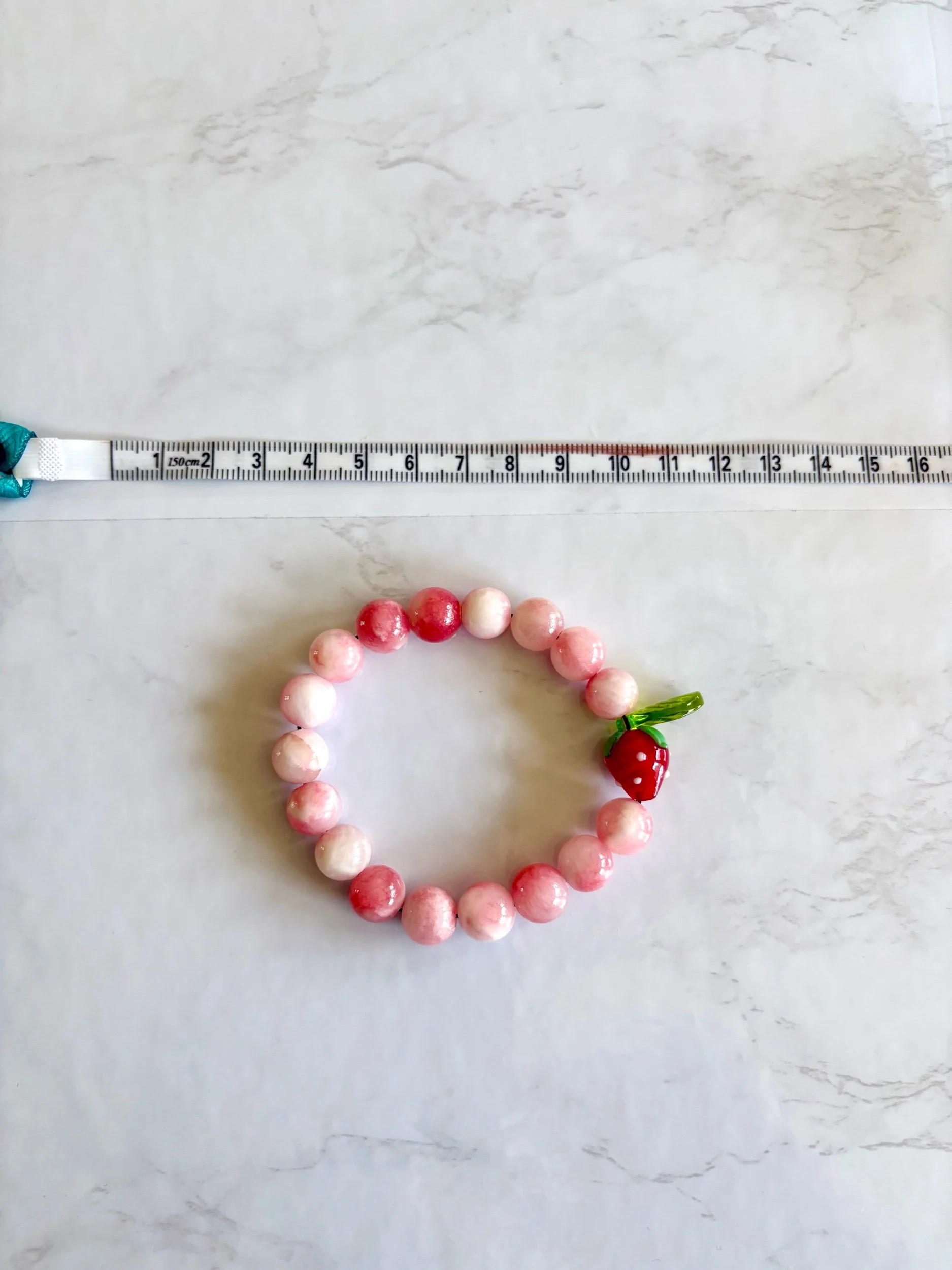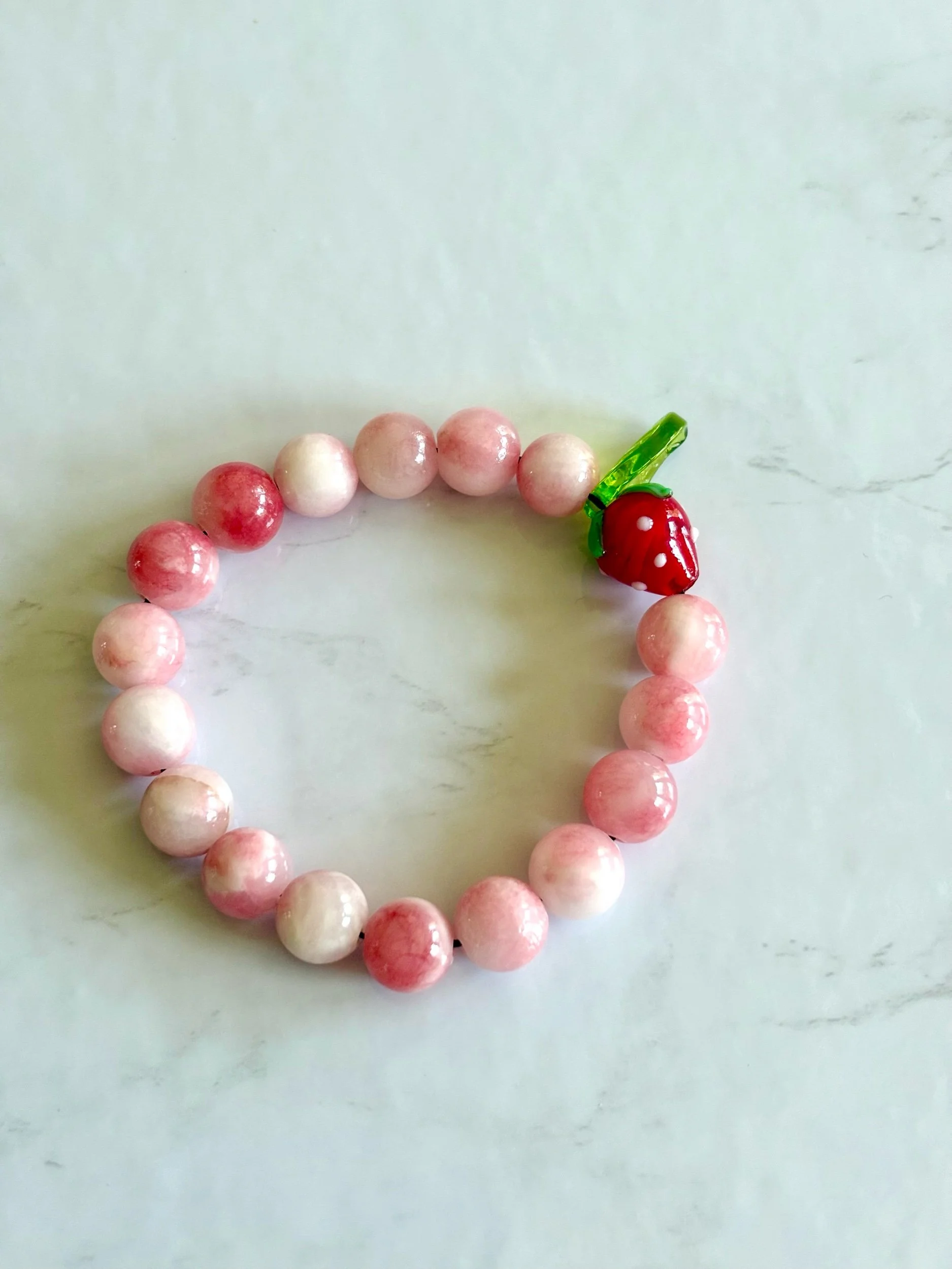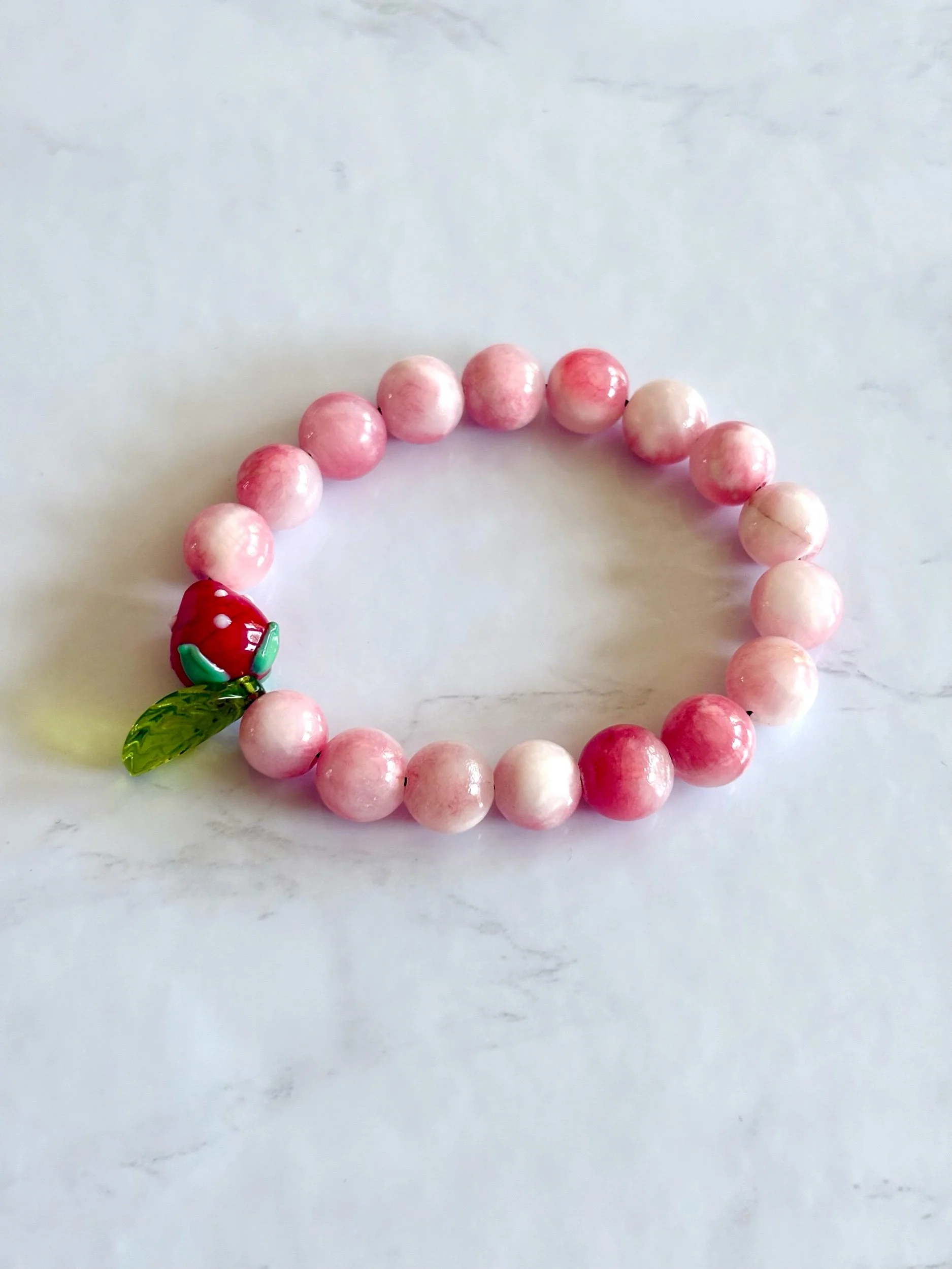 handmade pink jade gemstone bracelet with blown glass strawberry and leaf charm beads. made with high-quality, sturdy stretchy elastic band.
